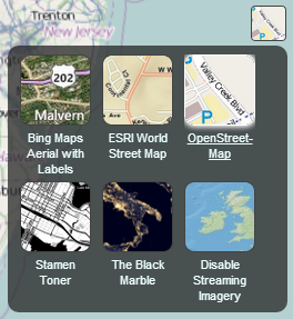 The BaseLayerPicker is a single button widget that displays a panel of available imagery and terrain providers. When imagery is selected, the corresponding imagery layer is created and inserted as the base layer of the imagery collection; removing the existing base. When terrain is selected, it replaces the current terrain provider. Each item in the available providers list contains a name, a representative icon, and a tooltip to display more information when hovered. The list is initially empty, and must be configured before use, as illustrated in the below example.